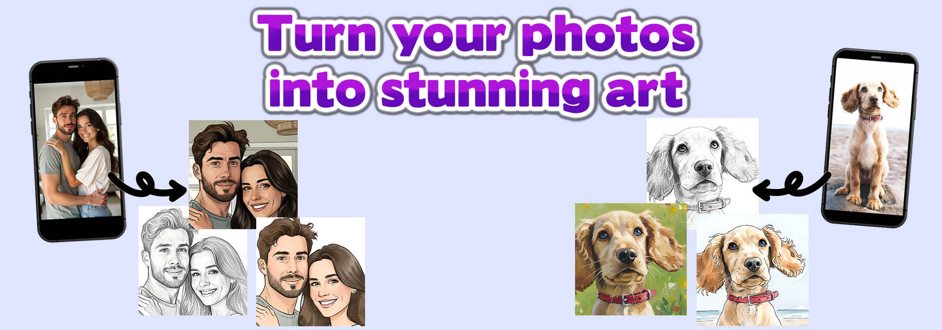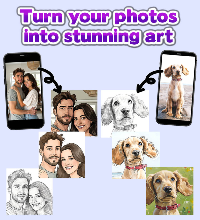 We create truely personalised digital portraits from your own photos. Capturing the essence of the original photo and maintaining recognisable faces, turning a cherished moment, person or pet into a timeless momento to hang on the wall or gift. Get instant previews too, with the latest AI tools creating remarkable results.